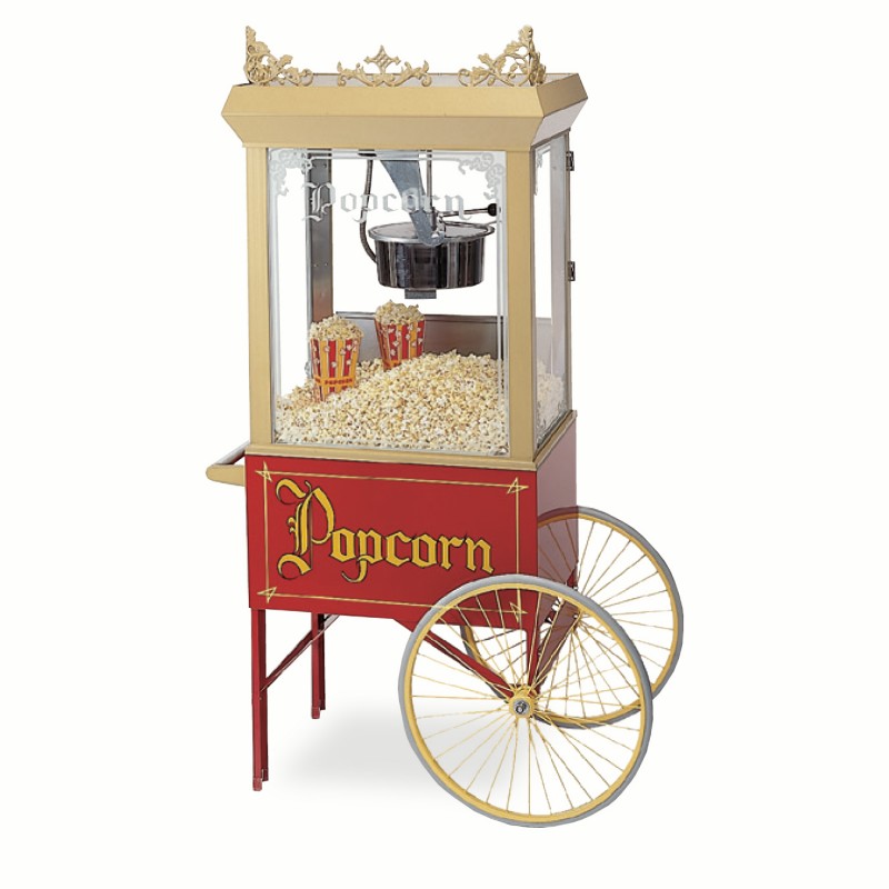 This heavy duty 12 oz popper will transport popcorn seekers back to another era with its beautiful etched glass and antique brass finish. It features a Whiz bang stainless steel kettle. Cart #2015 is available separately.
