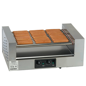 This midsize hot dog grill has a flat cook surface and 10 rollers. It features separate temperature, stainless steel cabinet and drip tray, and roller controls for front and rear rollers. Bun warmer and sneeze guard sold separately.